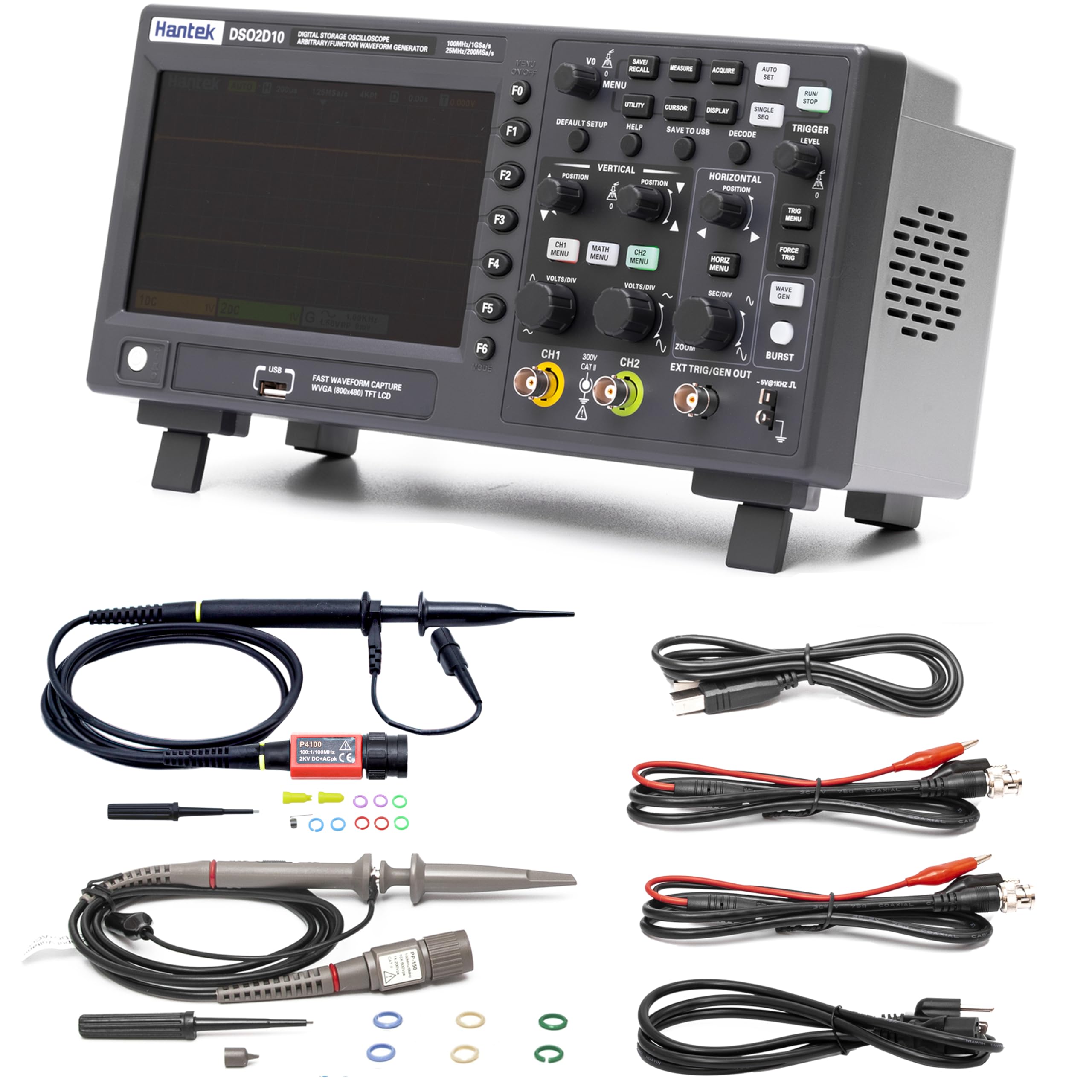 A 100MHz two-channel oscilloscope with signal generation capabilities for electronic testing and debugging. Comes with an EU plug.