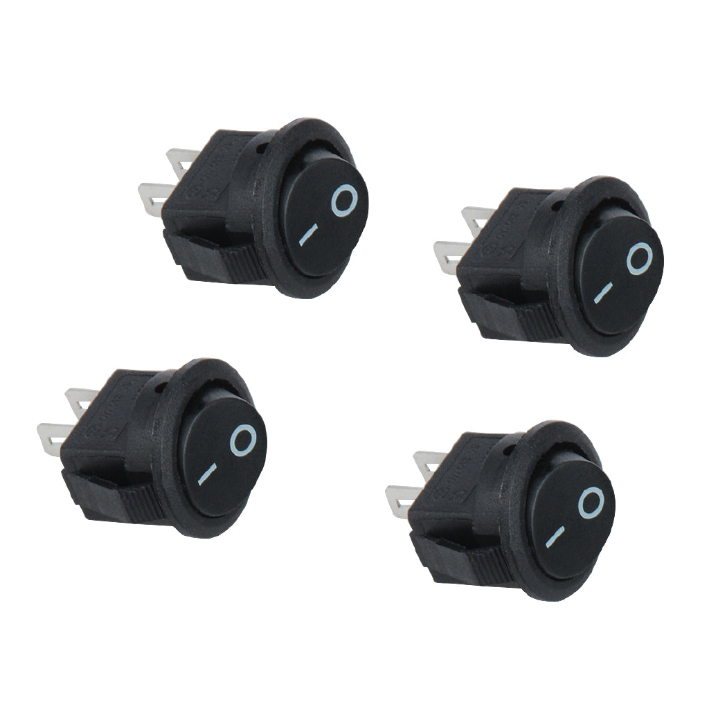 A small, round, black rocker switch with two pins. Rocker switches are commonly used to control the power supply in electronic devices, and this particular one is suitable for smaller applications.
