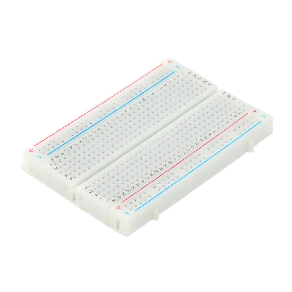A solderless breadboard with 400 points for creating and testing circuits without soldering.