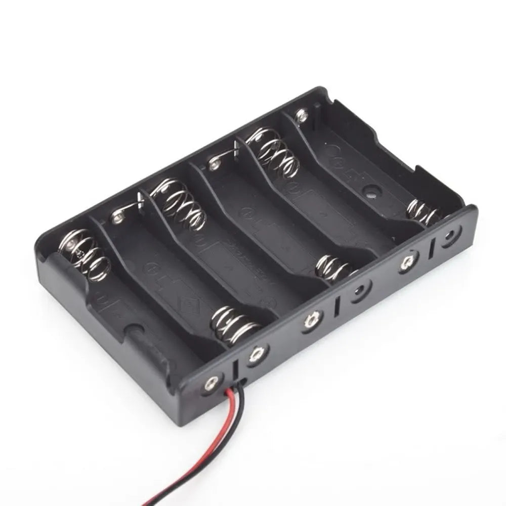 A 6 x AA battery holder box without cover, providing a convenient way to organize and power electronic devices with AA batteries.