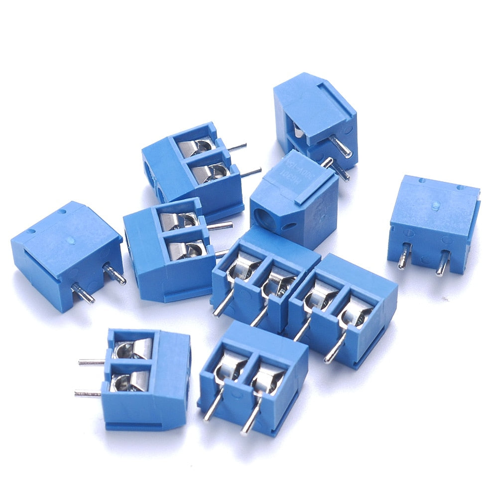 This set includes five KF301-2P 5.08mm blue screw terminals with 2 pins each. Screw terminals are commonly used for secure wire connections in electronic circuits.