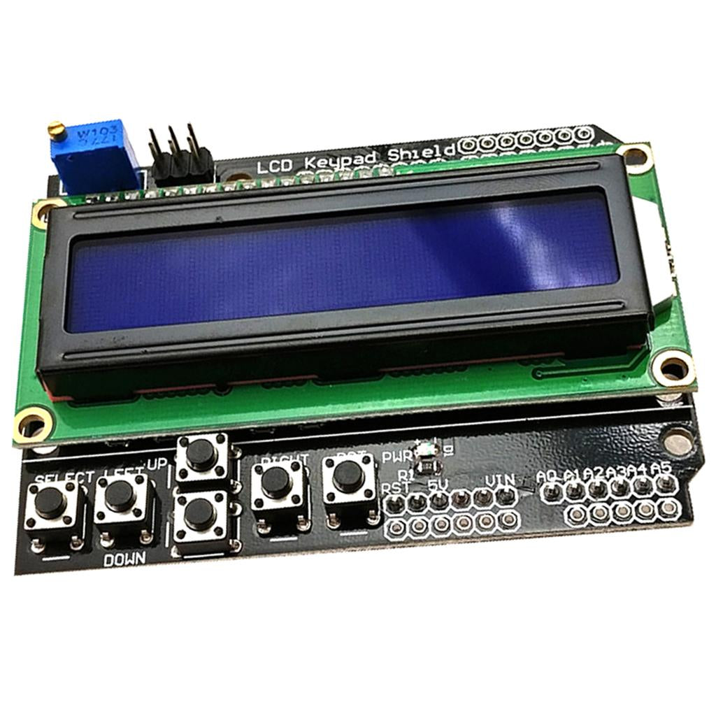 A shield that combines a 16x2 character LCD with a keypad, featuring a blue backlight for Arduino projects.