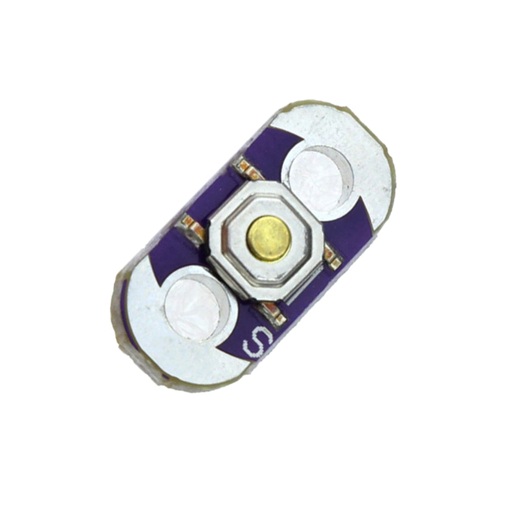 A LilyPad button board featuring a momentary push button, suitable for user input in LilyPad wearable projects.