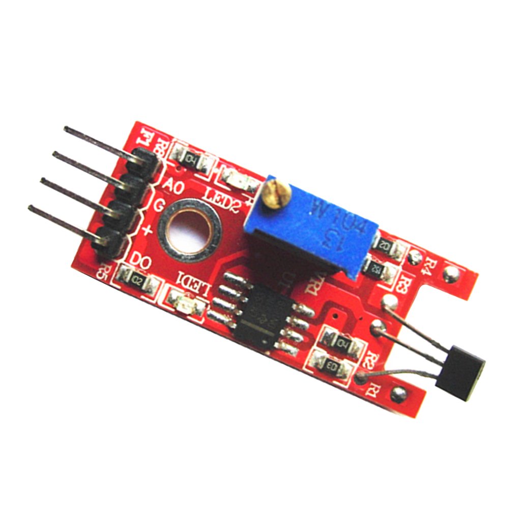 A linear magnetic Hall sensor module that measures the strength of a magnetic field, commonly used for proximity detection or position sensing.