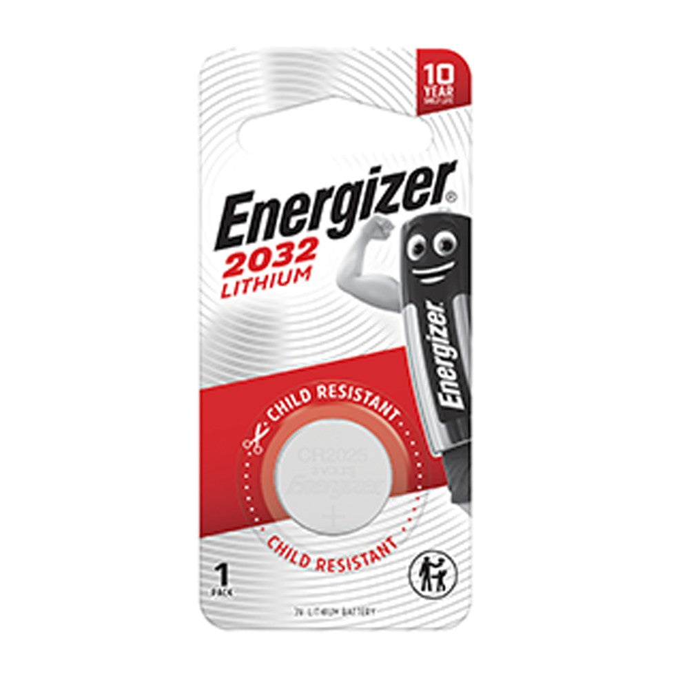 A coin cell battery with a 3V output, model CR2032, manufactured by Energizer. It is commonly used in small electronic devices.