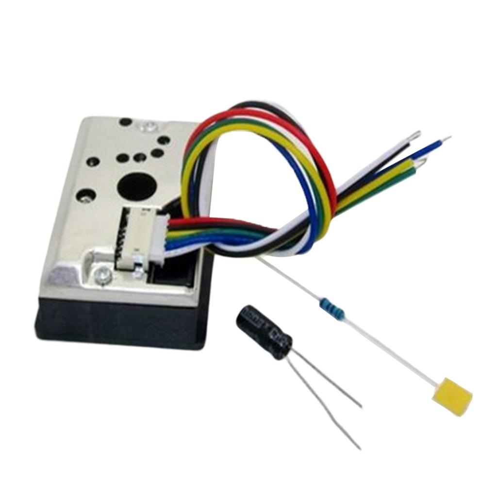 A sensor designed to detect and measure particulate matter (PM2.5) in the air. It includes a cable, capacitor, and resistor for proper connection and signal conditioning.